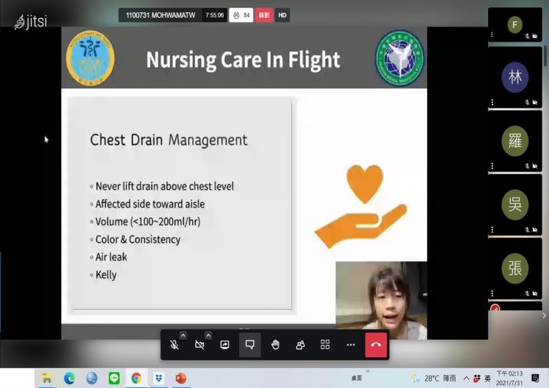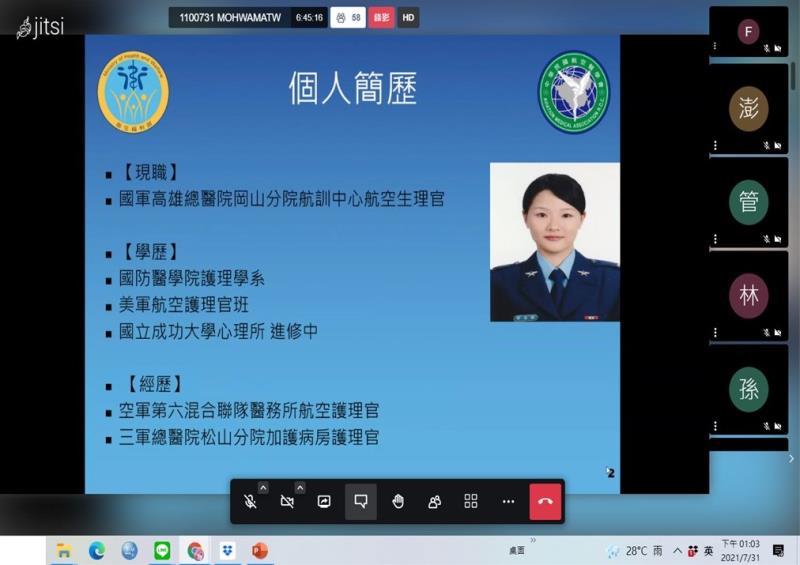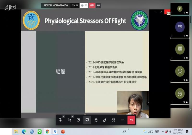 《空軍第六混合聯隊吳佳蕙航空護理官以「航程照護(一)」為題進行視訊授課》