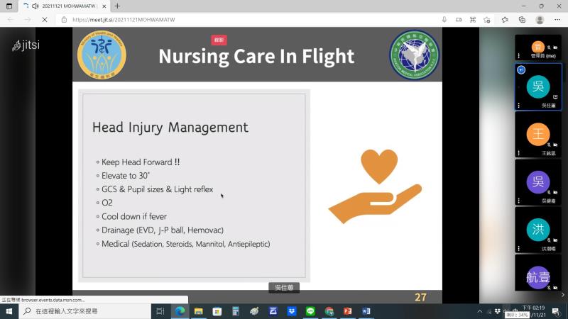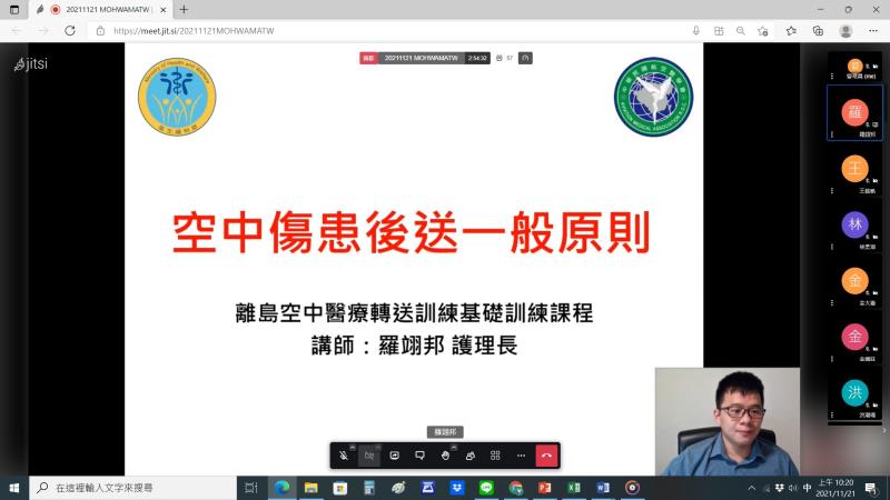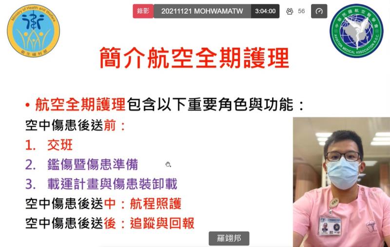 《三軍總醫院松山分院急診部羅翊邦護理長以「空中傷患後送一般原則」為題進行視訊授課》