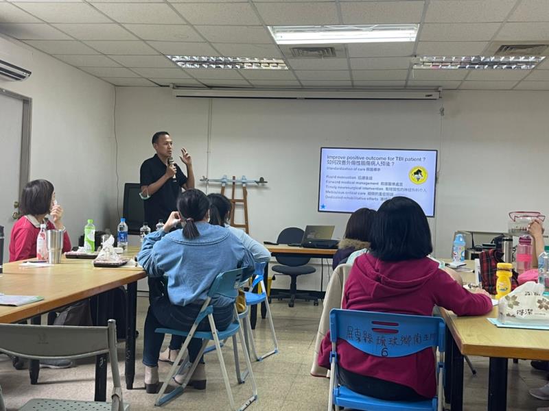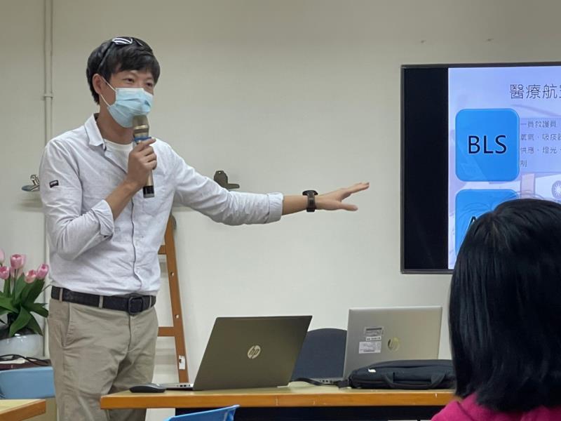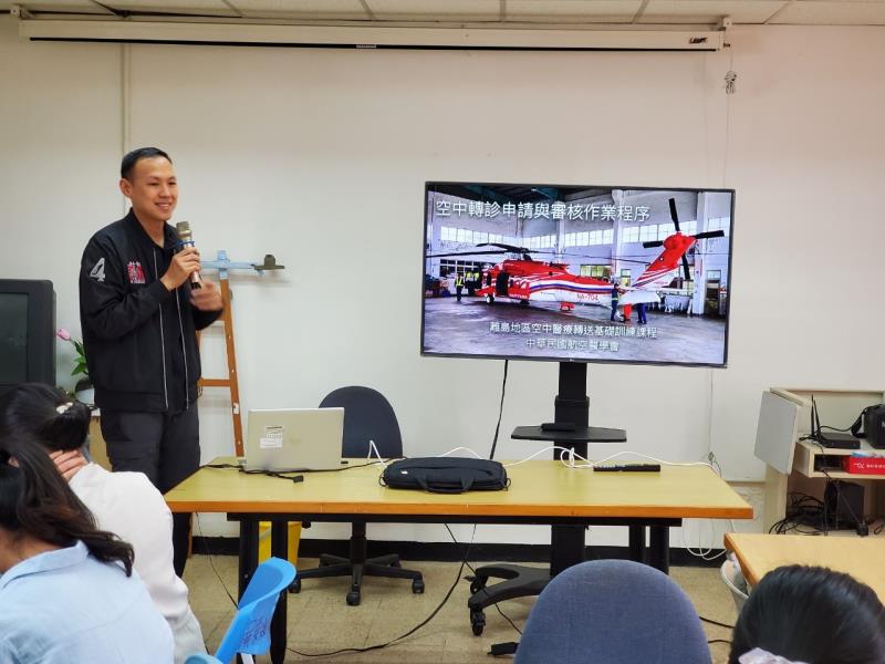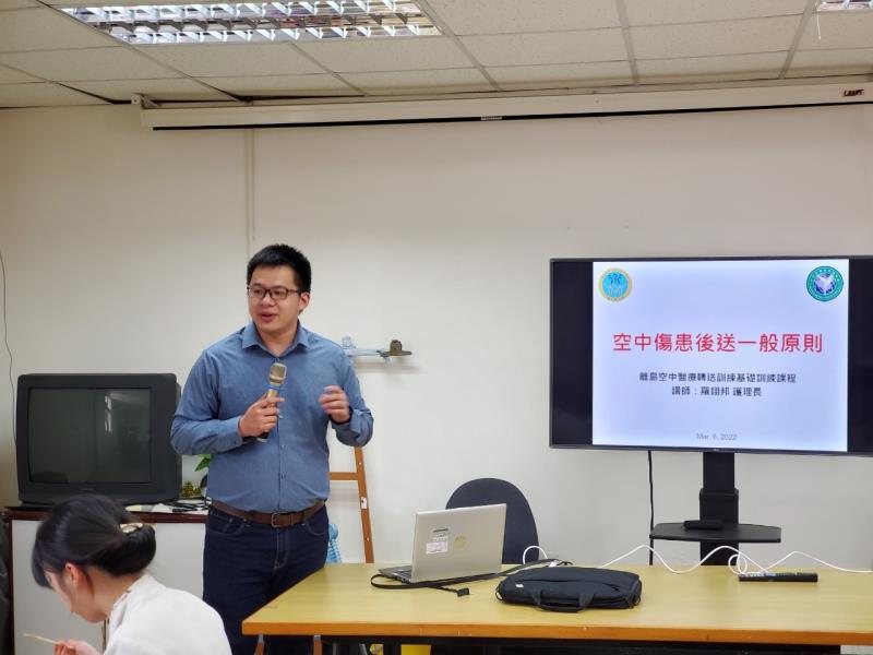 《三軍總醫院松山分院急診室 羅翊邦護理長以「空中傷患後送一般原則」、「航程照護(一)」為題進行授課》